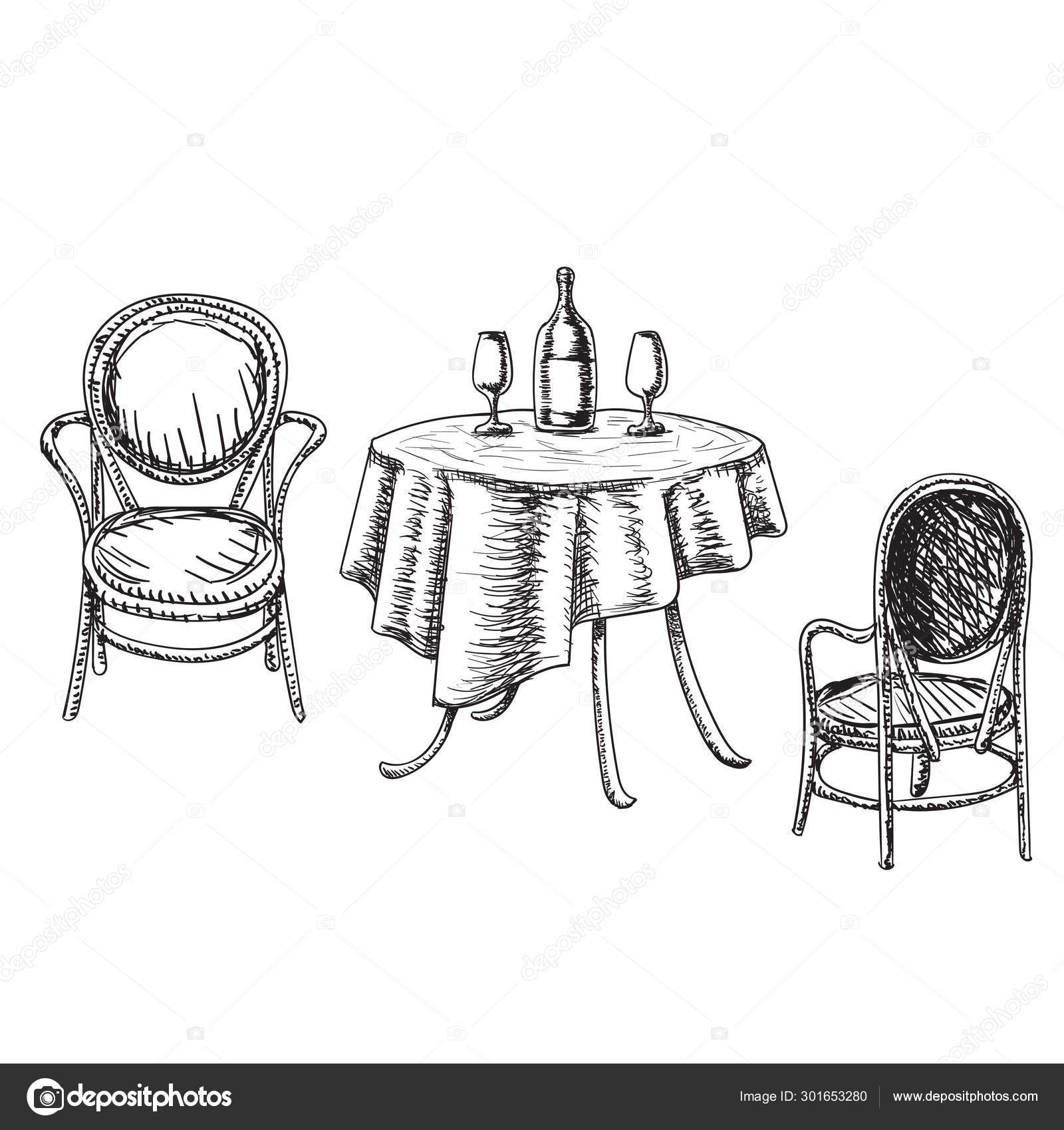 Dining Table With Glasses Of Wine And Flower Hand Drawn Sketch