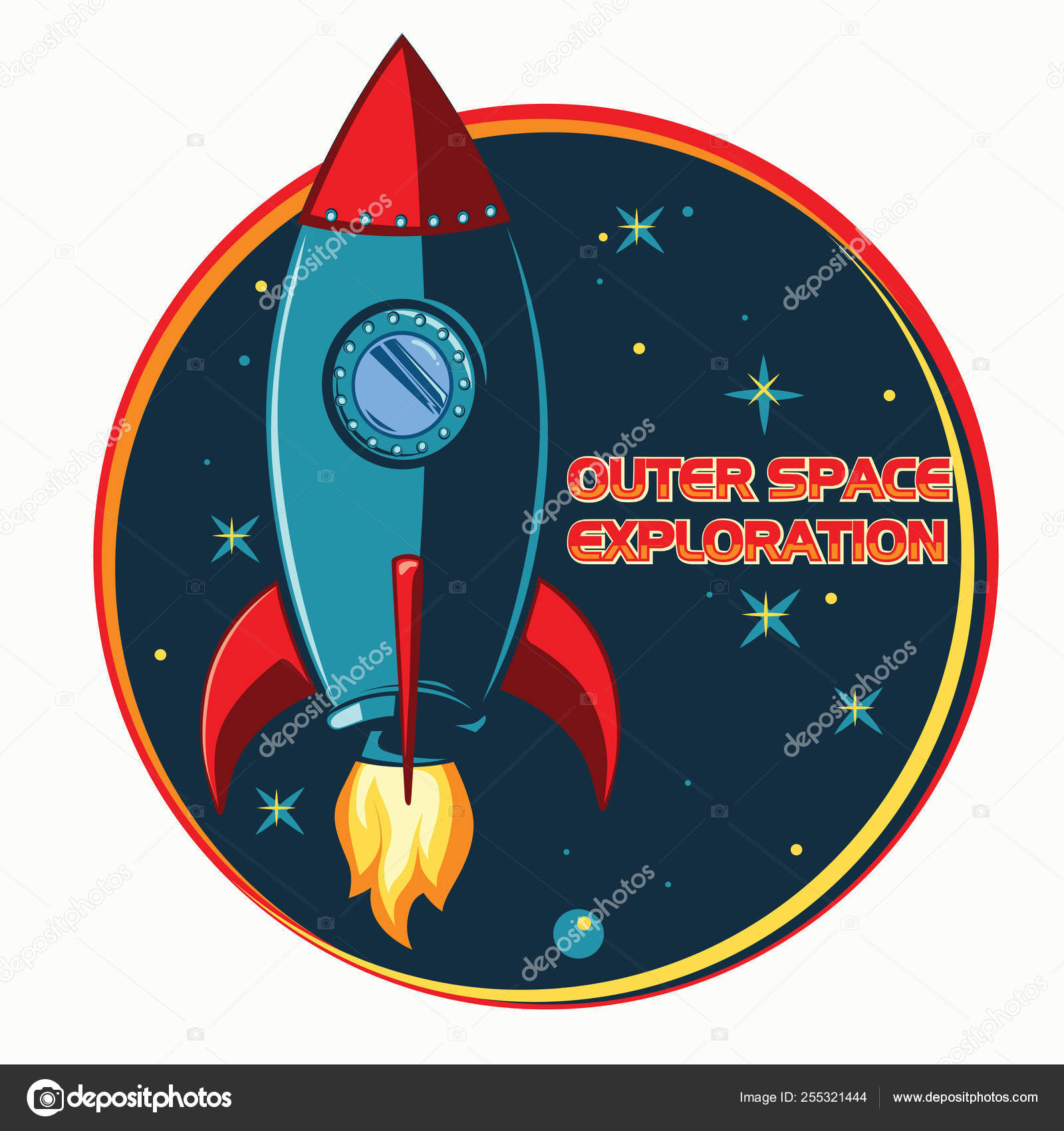 Outer Space Exploration Emblem Vintage Cartoon Rocket Stock