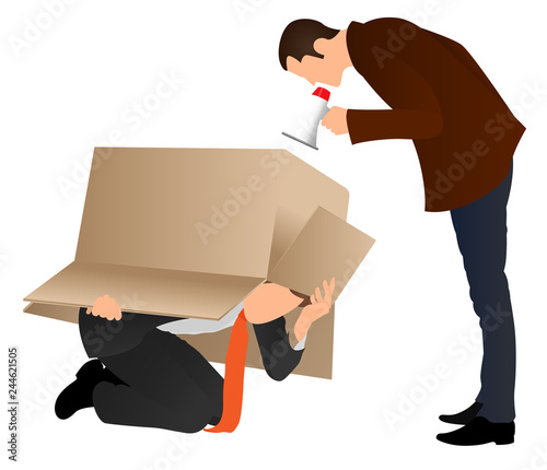 Problems At Work Businessman Hiding Under Cardboard Box Boss